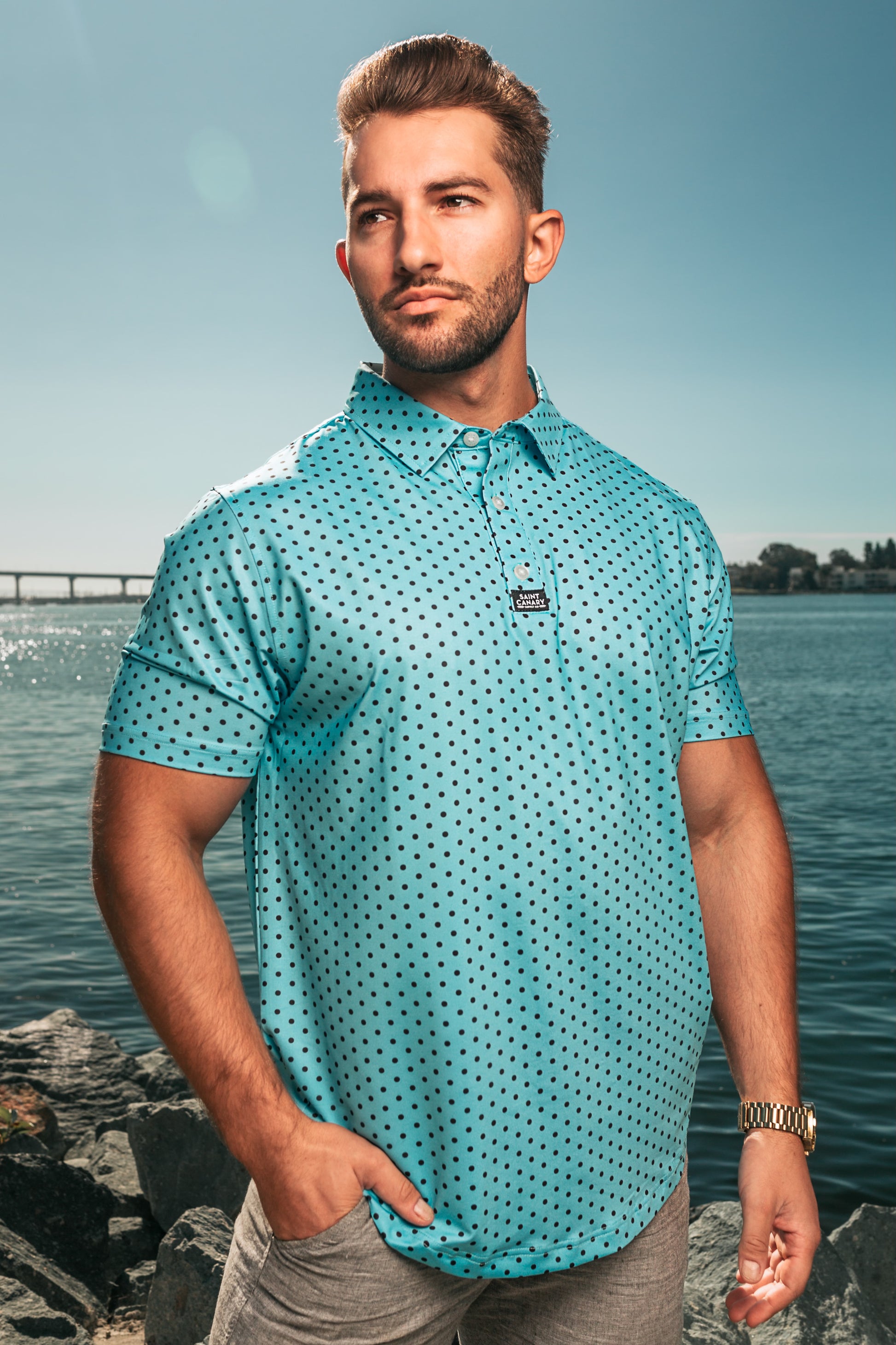 Our Canary Dot polo combines style and function with a polyester and spandex blend. The moisture-wicking fabric keeps you cool, dry, and comfortable, making it ideal for everything from business meetings to a day on the golf course. Elevate your wardrobe and performance with our versatile polo.